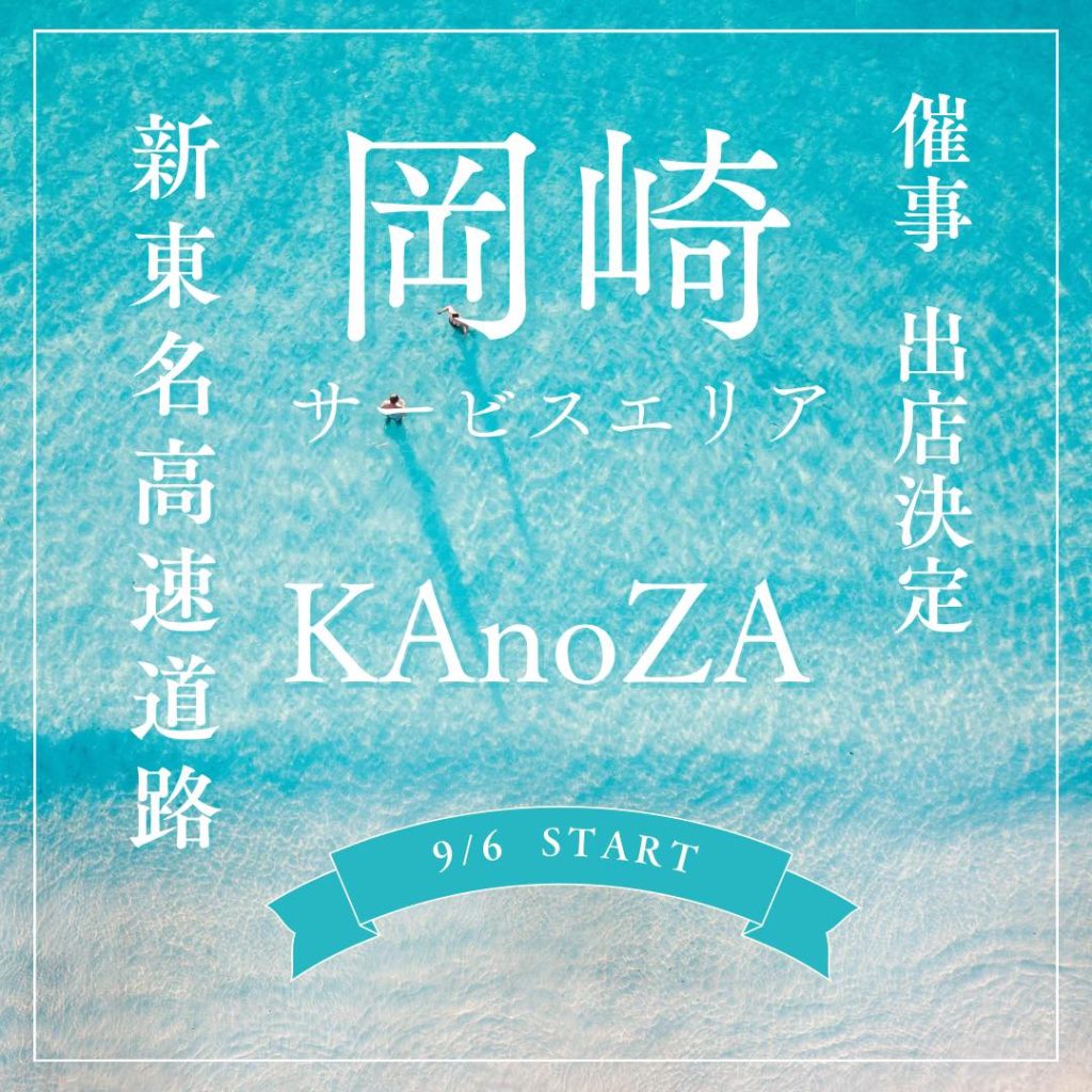 期間 9月6日(金)〜10月6日(日) 時間 10:00〜19:00 場所 新東名高速道路の岡崎SA(上下線集約) KAnoZAの人気商品をご用意して販売致します! この機会にお近くの方、ぜひお待ちしております。
